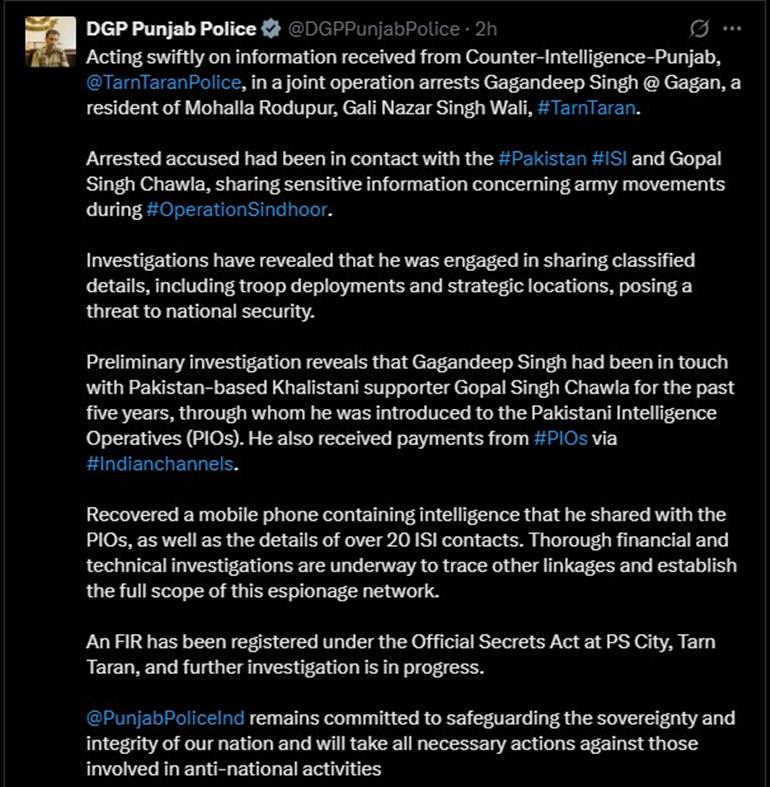 Acting swiftly, Punjab Police have arrested Gagandeep Singh of Tarn Taran for sharing sensitive information concerning army movements during Operation Sindoor, Director General of Police Guarav Yadav said on Tuesday.