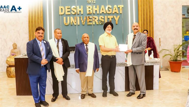 Desh Bhagat University (NAAC A+) extended a warm welcome to a distinguished delegation from the High Commission of Papua New Guinea, led by H.E. Mr. Vincent W. Sumale, High Commissioner, accompanied by Philibert Keaike, First Secretary, and Barun Mukherjee, Finance Officer. The delegation was received by Dr. Zora Singh, Chancellor, and Dr. Harsh Sadawarti, Vice-Chancellor, along with members of the senior management team and students from Papua New Guinea studying at the university.