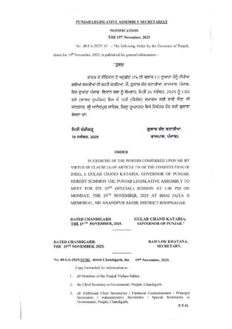 Punjab Vidhan Sabha will hold its 10th Special session on the occasion of 350th Shaheedi Gurpurab at Sri Anandpur Sahib on November 24, 2025.