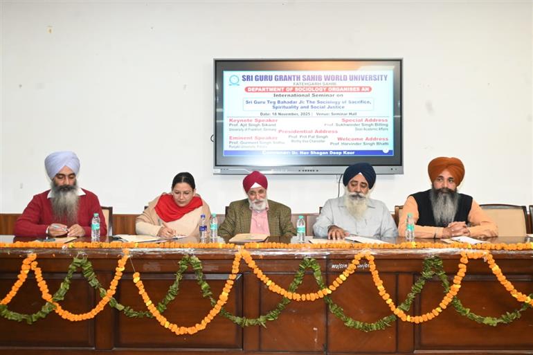 Sri Guru Granth Sahib World University, Fatehgarh Sahib, organized an International Seminar on November 18, 2025, on the theme “Sri Guru Tegh Bahadur Ji: The Sociology of Sacrifice, Spirituality and Social Justice.” Scholars from India and abroad reflected on Guru Tegh Bahadur Ji’s universal message. Key speakers included Prof. Ajit Singh Sikand, Prof. Harvinder Singh Bhatti, and Prof. Gurmeet Singh Sidhu. Vice-Chancellor Prof. Prit Pal Singh appreciated the initiative. The event was led by Dr. Nav Shagan Deep Kaur and conducted by Assistant Prof. Ekroop Kaur.