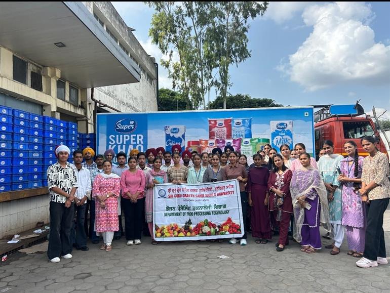 ਸ੍ਰੀ ਗੁਰੂ ਗ੍ਰੰਥ ਸਾਹਿਬ ਵਰਲਡ ਯੁਨੀਵਰਸਿਟੀ, ਫਤਿਹਗੜ੍ਹ ਸਾਹਿਬ ਦੇ ਫੂਡ ਪ੍ਰੋਸੈਸਿੰਗ ਟੈਕਨੋਲੋਜੀ ਵਿਭਾਗ ਦੇ ਬੀ. ਟੈਕ ਪਹਿਲੇ ਅਤੇ ਤੀਜੇ ਸਮੈਸਟਰ ਅਤੇ ਐੱਮ.ਐੱਸ.ਸੀ ਪਹਿਲੇ ਸਮੈਸਟਰ ਦੇ ਵਿਦਿਆਰਥੀਆਂ ਨੇ ਐਚ ਐੱਫ ਸੁਪਰ ਪਲਾਂਟ ਦਾ ਦੌਰਾ ਕੀਤਾ। ਵਿਦਿਆਰਥੀਆਂ ਦਾ ਦਿਸ਼ਾ ਨਿਰਦੇਸ਼ ਡਾ. ਦਿਕਸ਼ਾ ਗਰਗ ਅਤੇ ਪ੍ਰਭਜੀਤ ਕੌਰ, ਅਤੇ ਦੌਰੇ ਦਾ ਸੰਚਾਲਨ ਅਸਿਸਟੈਂਟ ਪ੍ਰੋਫੈਸਰ ਕੋਮਲਪ੍ਰੀਤ ਕੌਰ ਨੇ ਵਿਭਾਗੀ ਇੰਚਾਰਜ ਡਾ. ਰੁਪਿੰਦਰ ਪਾਲ ਸਿੰਘ ਦੀ ਸਰਪ੍ਰਸਤੀ ਹੇਠ ਕੀਤਾ ਗਿਆ।